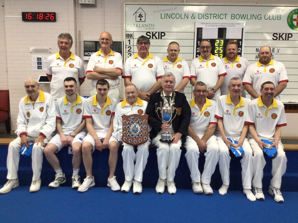 Winners of the 2023 Derbyshire Trophy: Pictured are Mick Thompson, John Withers, Dennis Skayman, Ian Clarke, Neil East, Mark Robinson, Paul Johnson, Brian Day, Nathan Dunnington, Jonathan West, Derek Johnson (Chairman) Paul Hickman (President) Trevor Bannister, Paul Flatters, Rod West. Lincolnshire also shared the Stuart Waites Trophy (As overall National Champions)