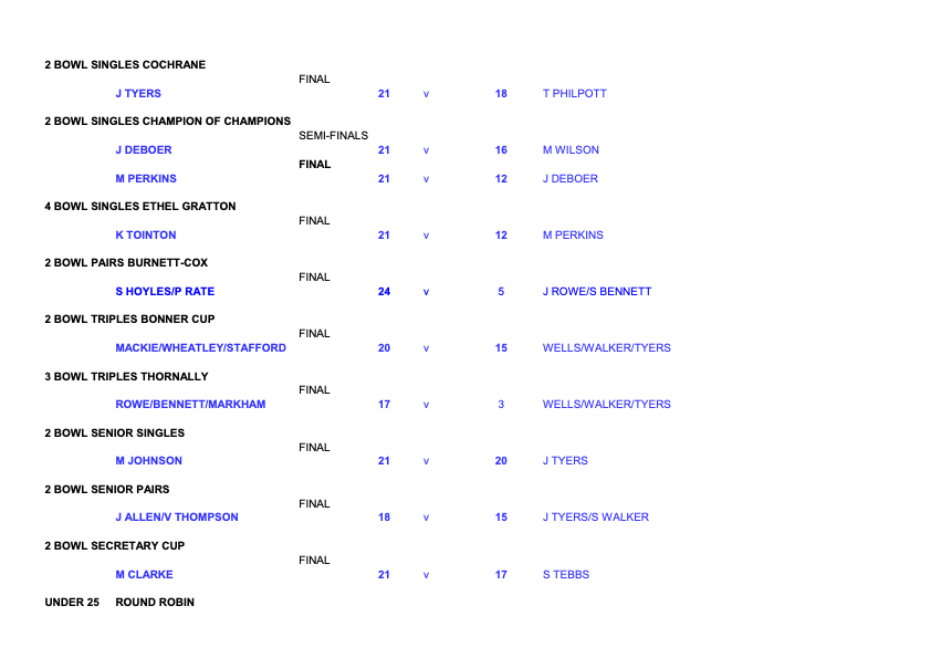 - 2 Bowl Pairs (Burnett-Cox Trophy) 21 Ends
